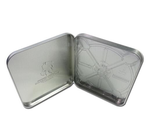 This hinged lid CD tin holder is 2-pc structure ( hinged lid + base ). With the embossing logo in the lid, customers can remember your items.