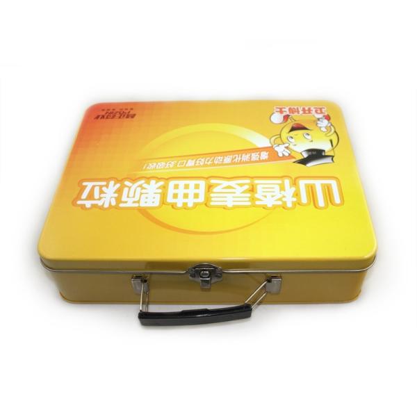This gift tin box with palstic handle is with custom printing design which will help you to attact more customers' eyes and increase your sales. The plastic handles can be various color to matach your design, like the below gift tin box can be with yellow color handle.